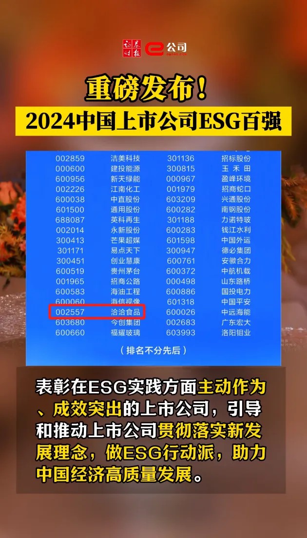 10月24日上午,“2024中国上市公司ESG百强”榜单正式揭晓!洽洽食品荣耀上榜!据悉,榜单由人民日报社旗下的主流财经媒体平台证券时报评出,旨在表彰在ESG实践方面主动作为,成效突出的上市公司,鼓励引导和推动上市公司贯彻落实新发展理念,做ESG行动派,助力中国经济高质量发展。