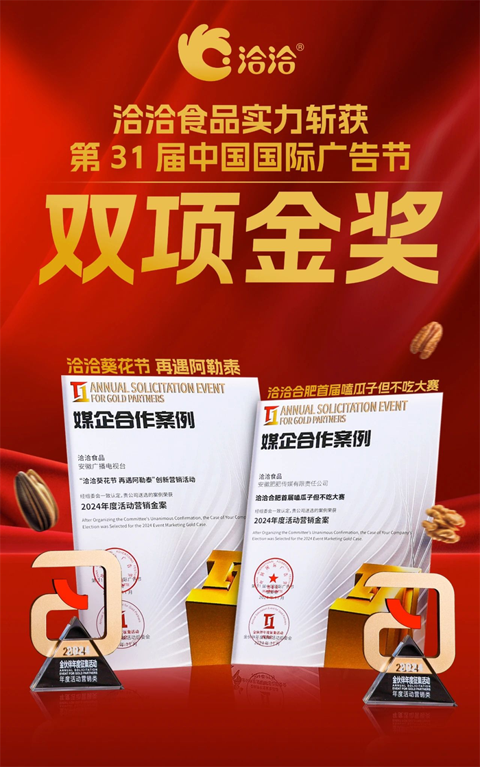 11月28日,第31届中国国际广告节在鹭岛厦门璀璨启幕,洽洽以其卓越的营销创意斩获“2024年度活动营销金案”双项金奖,分别是“洽洽合肥首届嗑瓜子但不吃大赛”和“洽洽葵花节,再遇阿勒泰”。