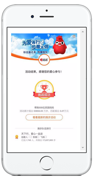 洽洽众消费者们、以及通过洽洽微信征集的粉丝们,根据活动规则,每捐赠5000步,洽洽对应捐出0.5元人民币,活动仅上线9天累计捐出5亿步!最后为近300位贫困母亲们每人送上了一份洽洽”母亲邮包”。