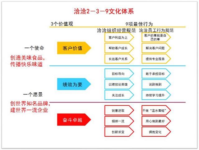 洽洽新的文化体系简称为“2-3-9文化体系”,是1个使命和1个愿景+3项核心价值观+9项最佳行为的组合。新的文化体系将企业的核心价值观与组织的经营规范、员工的行为规范一一对应,希望洽洽人做到知行合一,进而实现企业的突破制胜!