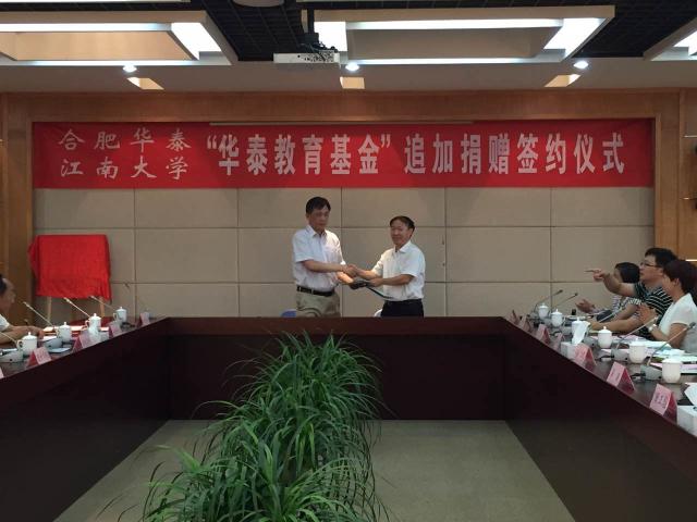2015年6月19日,合肥华泰集团股份有限公司与江南大学基金会签订协议,增加“江南大学华泰教育基金”额度500万,追加后的基金总额为800万元。