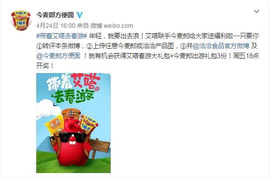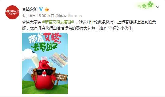 为扩大线上传播的影响力,最大可能地覆盖目标受众。洽洽与三全食品、今麦郎、梦洁家纺、君乐宝等10家官微进行品牌联动,以微博接力的方式陆续发起#带着艾嗒去春游#活动,吸引粉丝上传照片赢取春游大礼包。每周2家联合,周一周三发活动微博,持续豪礼放送1个月。