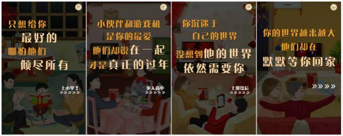 打开时光穿梭大门,重温每个人生阶段最典型的过年场景,勾起春节回忆,最后说出心里话、领取优惠券。这样构思H5,在提供表达情感渠道的同时,顺势助力年货销售。当H5在微信好友间流转,不但产出更多UGC,也进一步刺激了年货消费需求。
