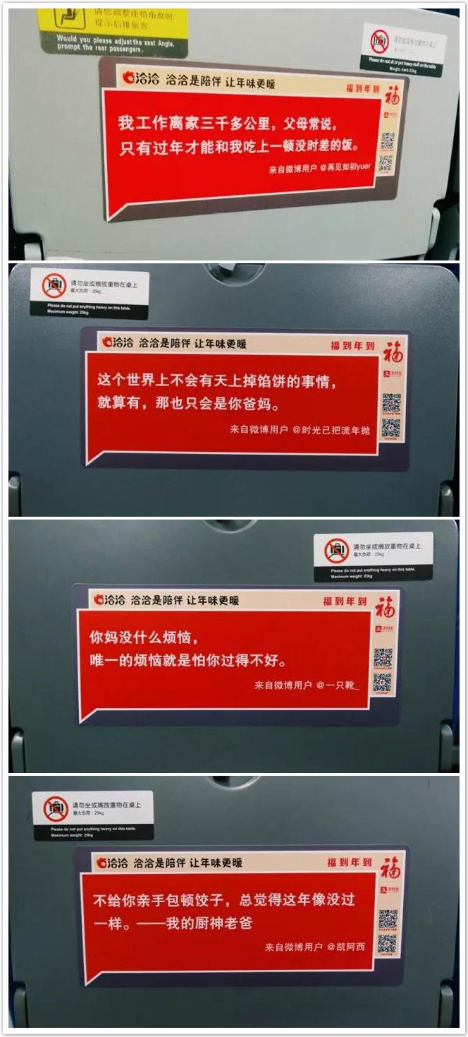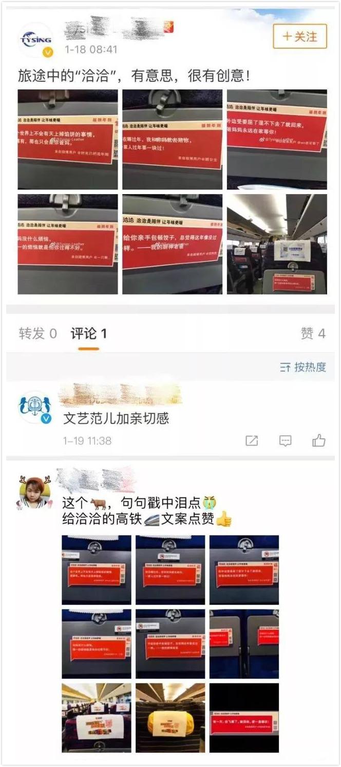 洽洽承包高铁,打造回家专列,不单植入广告提示“买年货选洽洽”,为销售助力;还在高铁小桌板投放一系列前期UGC活动中收集的暖心文案,在引起强烈共鸣的同时,与消费者进行深度沟通,强化品牌与年货、春节这些意向的关联。