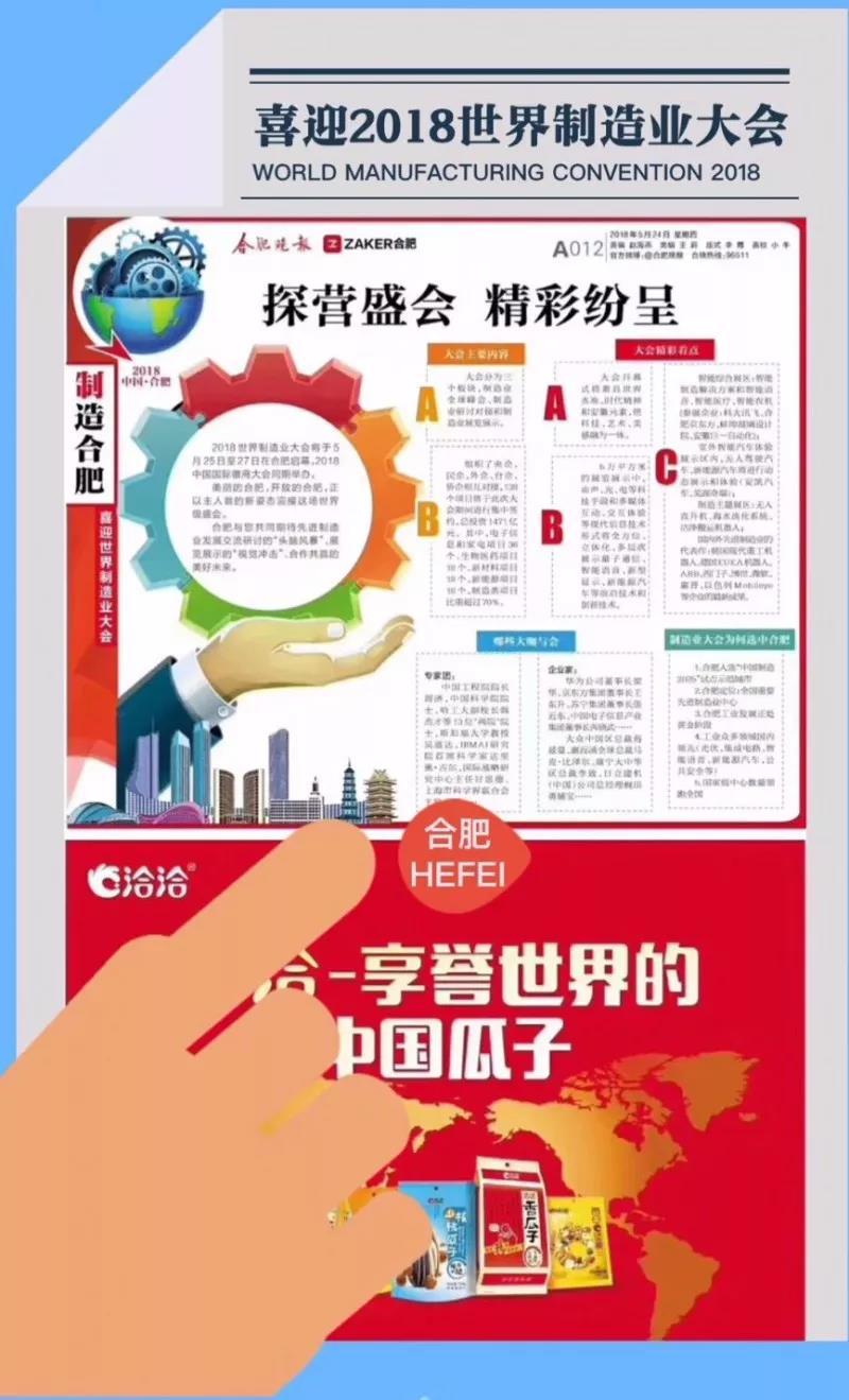 作为享誉世界的中国瓜子——洽洽品牌醒目亮相及展示在2018世界制造业大会官方唯一指定会刊,走进2018世界制造业大会和2018中国国际徽商大会会场,幸会4096位贵宾、国家领导人、108家境内外500强企业、165家国内制造业领军企业……让世界了解美丽合肥,让合肥品牌走向世界,世界将领略洽洽品牌的风采,感受它的澎湃活力。