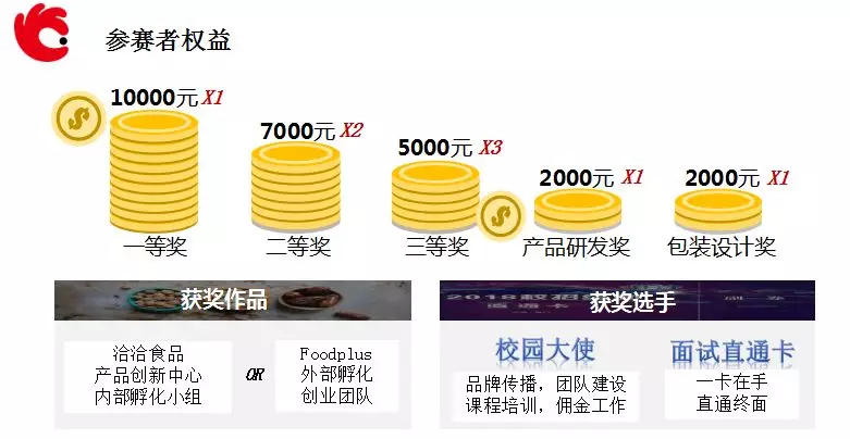 最终大赛将角逐出一、二、三等奖分别获10000元、7000元、5000元奖金;产品研发奖、包装设计奖分获2000元奖金。除丰厚奖金外,本届获奖创意将有机会由洽洽及FoodPlus孵化团队进行孵化落地,获奖选手还将成为洽洽校园大使,获得面试直通卡,先人一步直达终面!