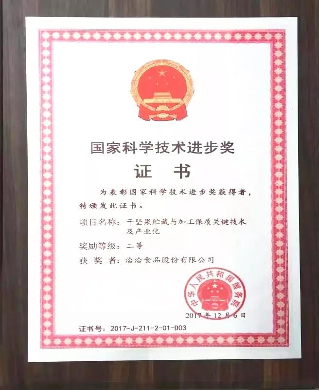 目前,洽洽深度参与的“坚果国家标准修订”已多达32项、且已获得38个国家级荣誉,如工信部授予了洽洽“坚果智能制造试点示范单位”荣誉,农业农村部也认证洽洽为“国家坚果加工技术研发专业中心”。洽洽所掌握的“干坚果储藏及加工保质关键技术”更是获得了国务院颁发的“国家科学技术进步奖”。