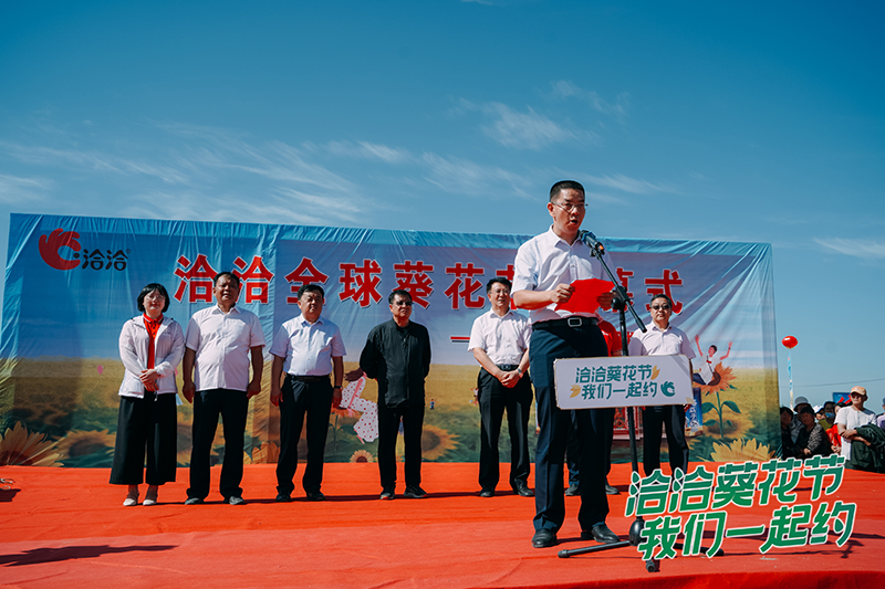 市、旗领导邱永红、郭宏、王国栋、李怀义以及洽洽食品集团副总裁陈俊等出席了洽洽全球葵花节的开幕式。在开幕仪式上,政府副旗长王新禄以及洽洽食品集团副总裁陈俊分别就此次活动进行了致辞,其中陈俊总表示“洽洽食品华葵农业部在推广订单农业的过程中,和巴彦淖尔地区展开密切合作,助力巴彦淖尔地区食葵在品种资源端不断创新进步发展”,并许下了希望和巴彦淖尔食葵产业一起“走出中国、走出亚洲、走向全球”的希冀,两方代表皆对洽洽与内蒙合作开展此次活动的意义进行了肯定,并对到场的消费者粉丝表达了美好祝愿。最后,市政府副市长邱永红宣布“洽洽全球葵花节”活动正式开始。