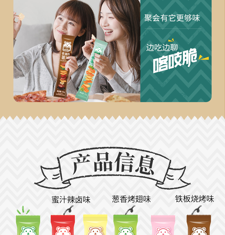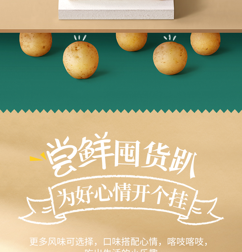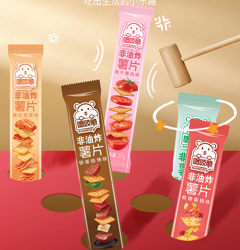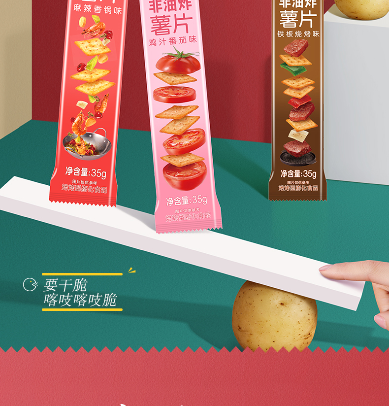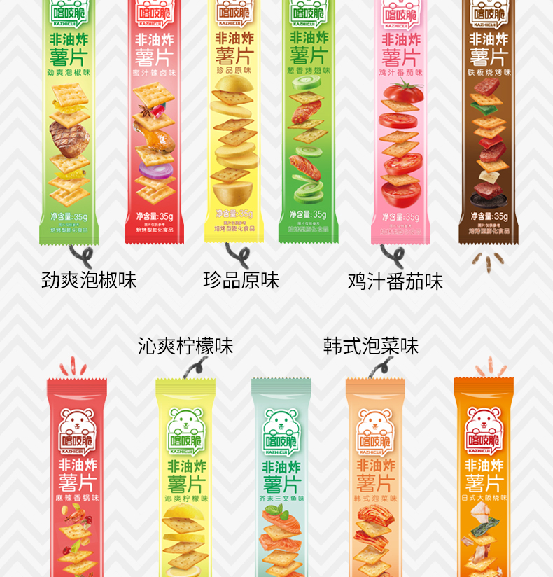 产品口味:麻辣香锅味、韩式泡菜味、珍品原味、葱香烤翅味、鸡汁番茄味、铁板烧烤味、黑松露脆薯片(黑椒味)、芝士脆薯片(原味)